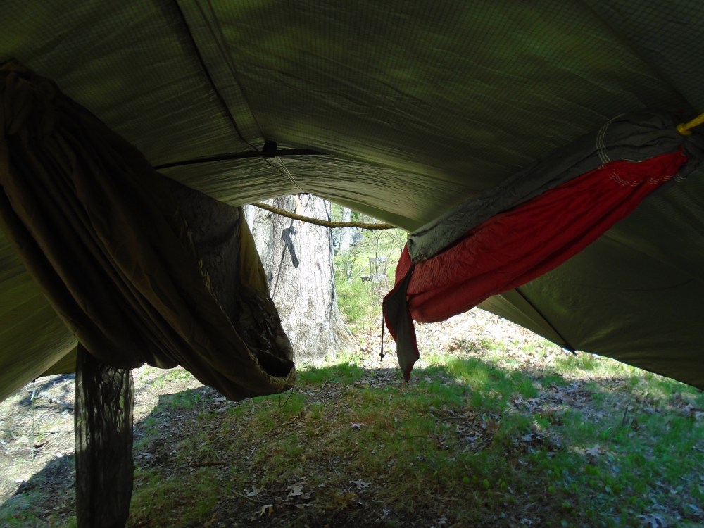 You may see that I have some poles along the ridgeline of the tarp which expands it give more room beneath in this photo, as well as the photo in the header.