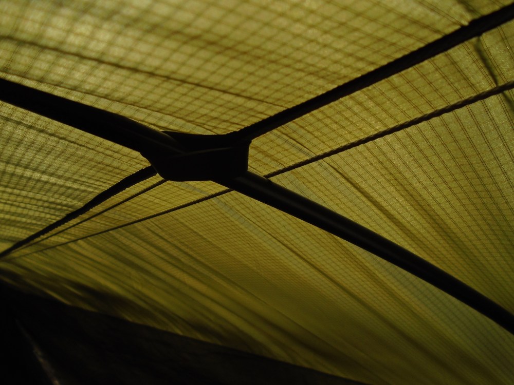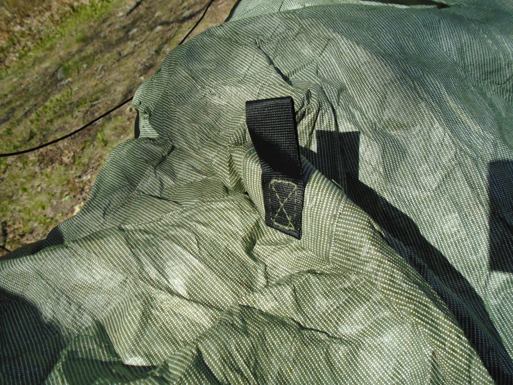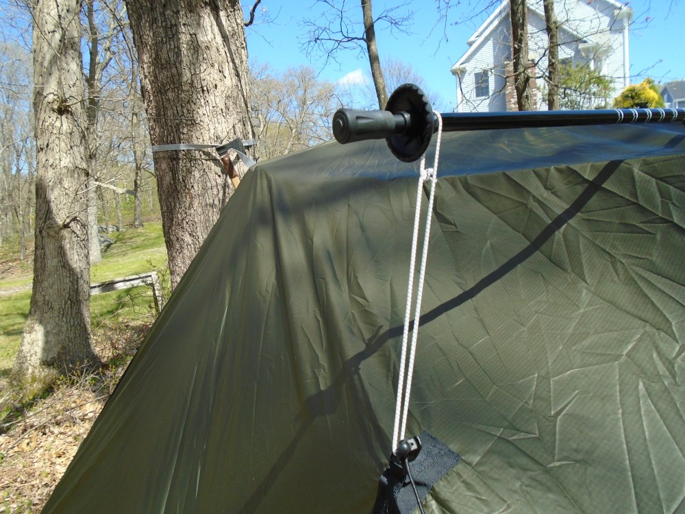 With the side panel pullouts on the Dutchware tarp, and some shock cord, I can extend the poles to their maximum length and use them to expand the tarp for maximum space beneath.