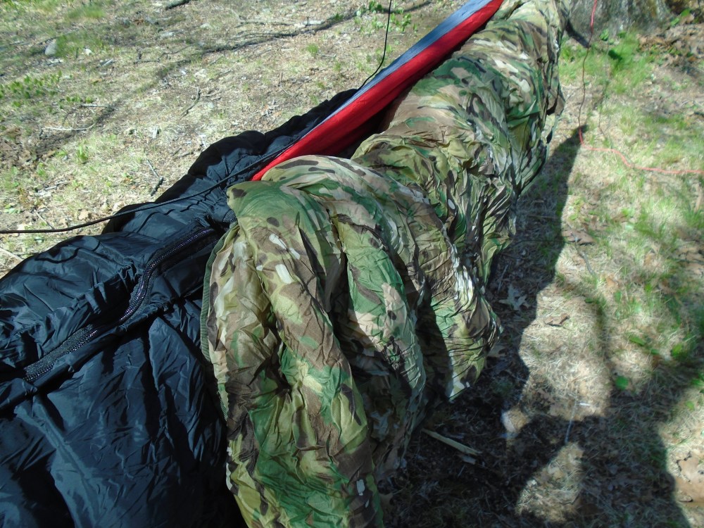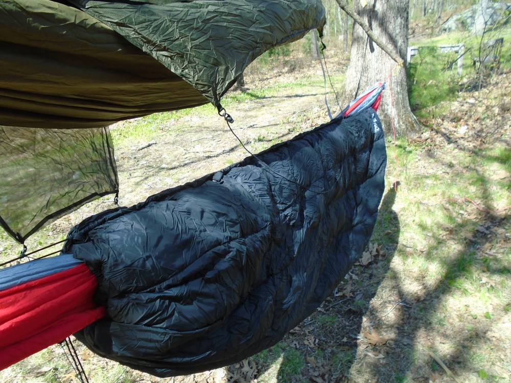 That should easily take me down to freezing temperatures if need be, along with my WI blanket. If the weather is really bitter, I can slide my Exped Synmat 7 into the hammock, which has a warmth rating of over 4, and the 2Go Systems Trifecta can cover the whole thing as a suspended bivy, wrapping me in down and tyvek with 2 layers of mylar around me.