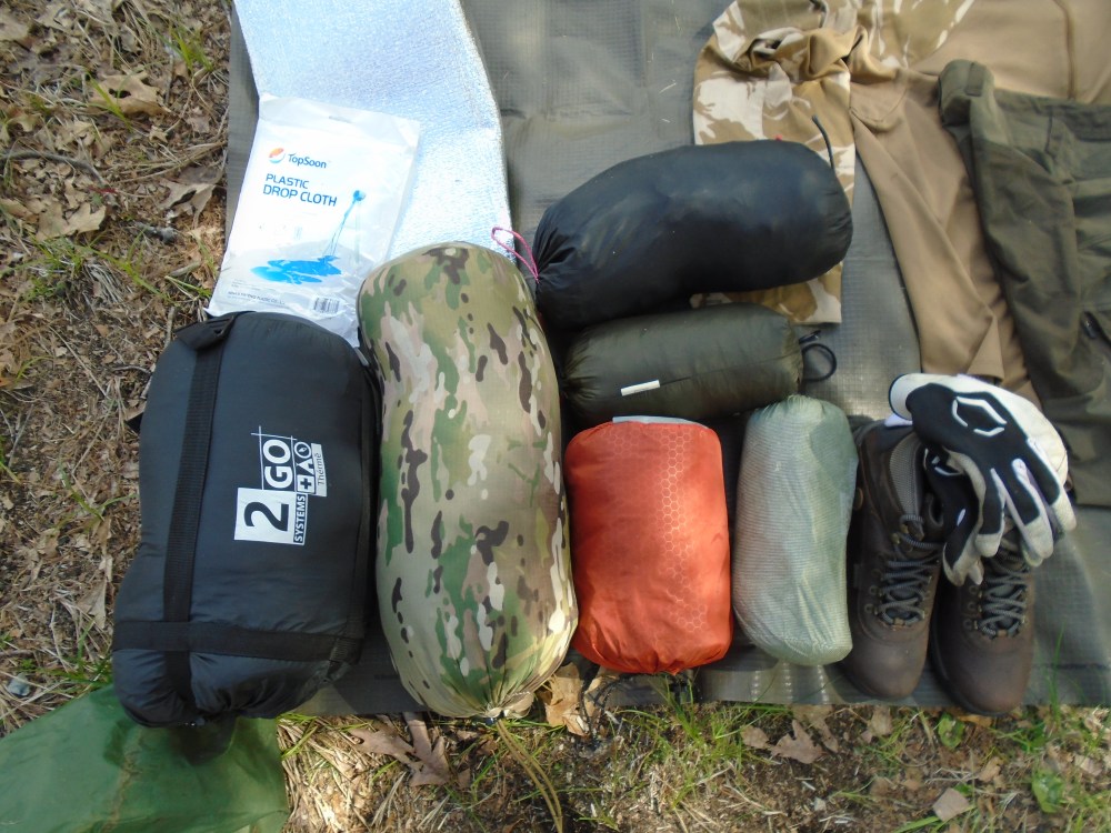 What I have in this photo are the following; Top left, a plastic drop cloth, and a piece of reflective foam much like the common windshield shades that people put in their cars to prevent the sun from turning their car into an oven. Left bottom, a 2Go Systems Therme sleeping bag, which is down with a layer of mylar sewn inside of it for it’s thermal reflective properties. In the camouflage stuff sack is a Wilderness Innovation PSB (Personal Survival Blanket), which is a closed cell foam blanket, which I have used for many years now, in all weather and seasons. The black stuff sack contains a Dutchware Gear Chameleon hammock, with double layer, with bugnet. In the green stuff sack below that is my Dutchware Gear Wide Winter Tarp, 12 foot xenon tarp with side panel pull outs. In the orange stuff sack is my sleeping pad, a Synmat 7 inflatable sleeping pad with internal insulation.